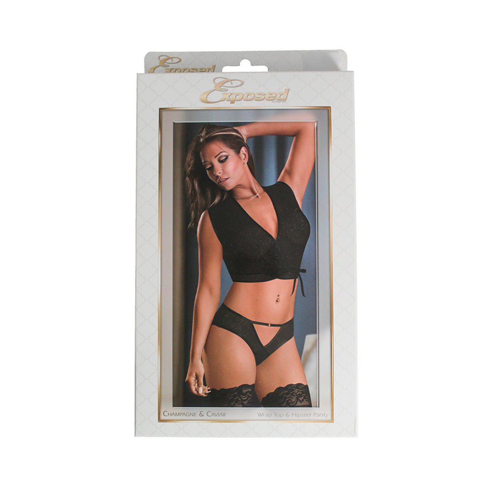From the Exposed by Magic Silk Collection, this style includes: A crop top featuring a non-restrictive design, mini cap sleeves, a deep V neckline, a wrap style front with a side tie closure with a buttonhole to secure the elastic, and a matching panty featuring a hipster style cut, a gold O-ring accent and keyhole cutout at the front, and cheeky back coverage. COLOR: BLACK@np2020-53
