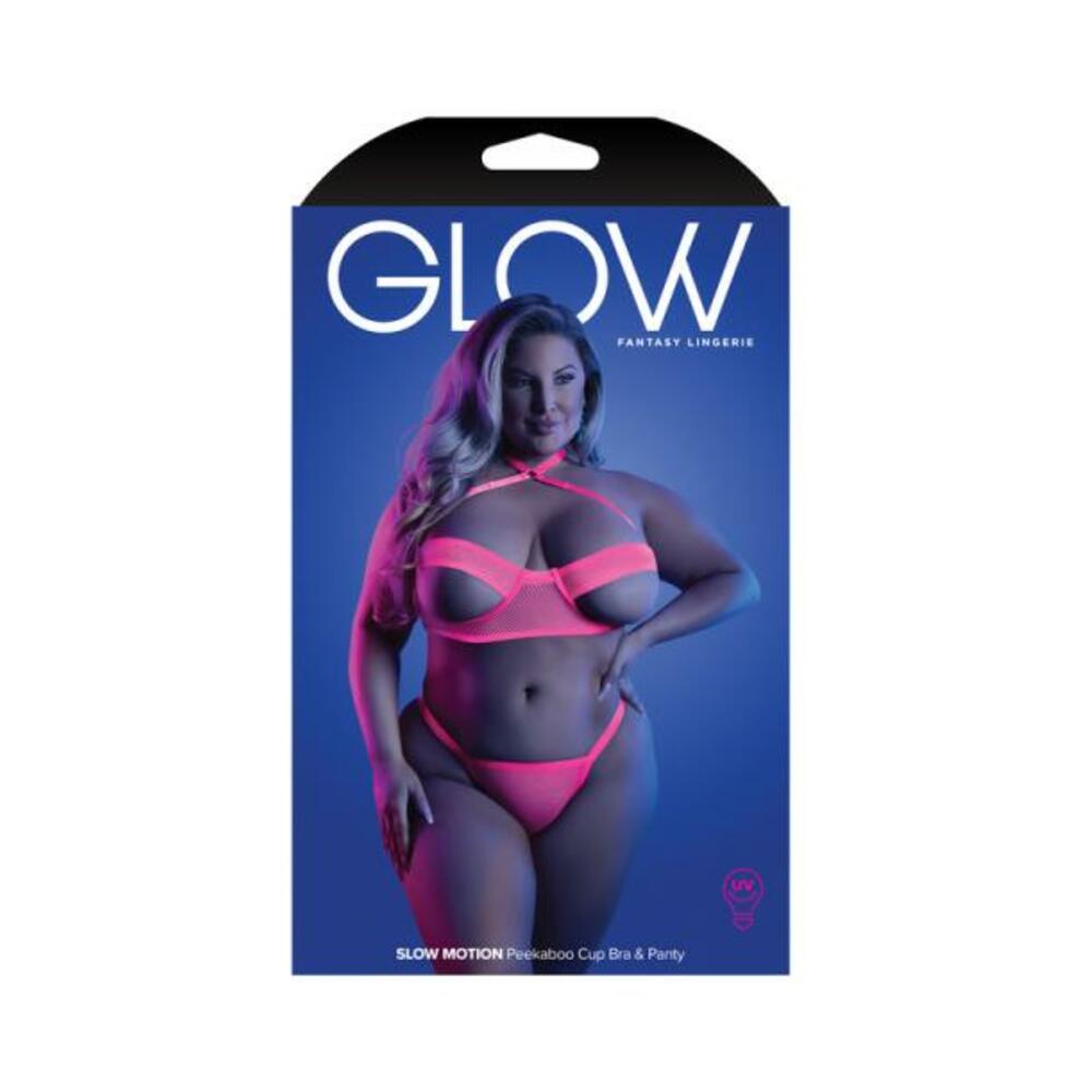 Fantasy Lingerie Glow Slow Motion Peek-a-boo Bra & Panty Neon Pink Queen Size
