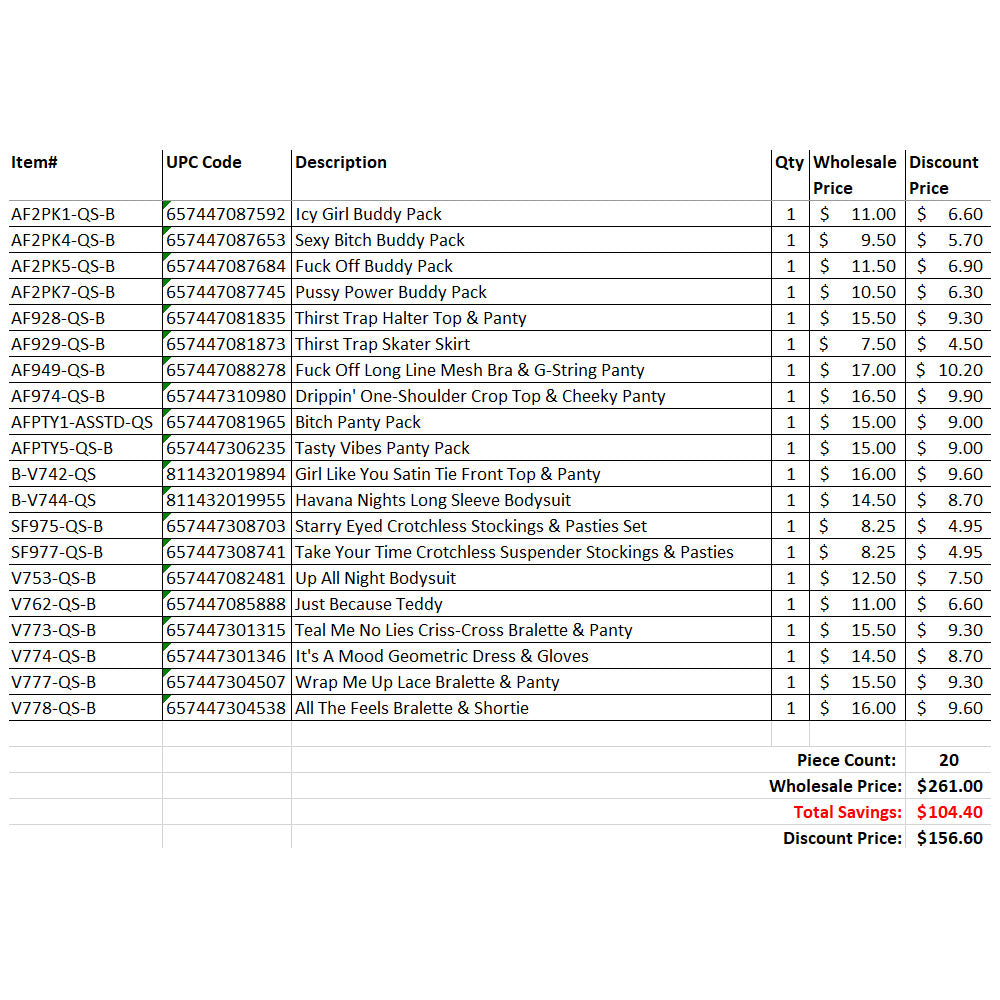 Item#: AF2PK1-QS-B | UPC#: 657447087592 | Icy Girl Buddy Pack | Price: $ 6.6Item#: AF2PK4-QS-B | UPC#: 657447087653 | Sexy Bitch Buddy Pack | Price: $ 5.7Item#: AF2PK5-QS-B | UPC#: 657447087684 | Fuck Off Buddy Pack | Price: $ 6.9Item#: AF2PK7-QS-B | UPC#: 657447087745 | Pussy Power Buddy Pack | Price: $ 6.3Item#: AF928-QS-B | UPC#: 657447081835 | Thirst Trap Halter Top & Panty | Price: $ 9.3Item#: AF929-QS-B | UPC#: 657447081873 | Thirst Trap Skater Skirt | Price: $ 4.5Item#: AF949-QS-B | UPC#: 657447088278 | Fuck Off Long Line Mesh Bra & G-String Panty | Price: $ 10.2Item#: AF974-QS-B | UPC#: 657447310980 | Drippin’ One-Shoulder Crop Top & Cheeky Panty | Price: $ 9.9Item#: AFPTY1-ASSTD-QS | UPC#: 657447081965 | Bitch Panty Pack | Price: $ 9Item#: AFPTY5-QS-B | UPC#: 657447306235 | Tasty Vibes Panty Pack | Price: $ 9Item#: B-V742-QS | UPC#: 811432019894 | Girl Like You Satin Tie Front Top & Panty | Price: $ 9.6Item#: B-V744-QS | UPC#: 811432019955 | Havana Nights Long Sleeve Bodysuit | Price: $ 8.7Item#: SF975-QS-B | UPC#: 657447308703 | Starry Eyed Crotchless Stockings & Pasties Set | Price: $ 4.95Item#: SF977-QS-B | UPC#: 657447308741 | Take Your Time Crotchless Suspender Stockings & Pasties | Price: $ 4.95Item#: V753-QS-B | UPC#: 657447082481 | Up All Night Bodysuit | Price: $ 7.5Item#: V762-QS-B | UPC#: 657447085888 | Just Because Teddy | Price: $ 6.6Item#: V773-QS-B | UPC#: 657447301315 | Teal Me No Lies Criss-Cross Bralette & Panty | Price: $ 9.3Item#: V774-QS-B | UPC#: 657447301346 | It’s A Mood Geometric Dress & Gloves | Price: $ 8.7Item#: V777-QS-B | UPC#: 657447304507 | Wrap Me Up Lace Bralette & Panty | Price: $ 9.3Item#: V778-QS-B | UPC#: 657447304538 | All The Feels Bralette & Shortie | Price: $ 9.6