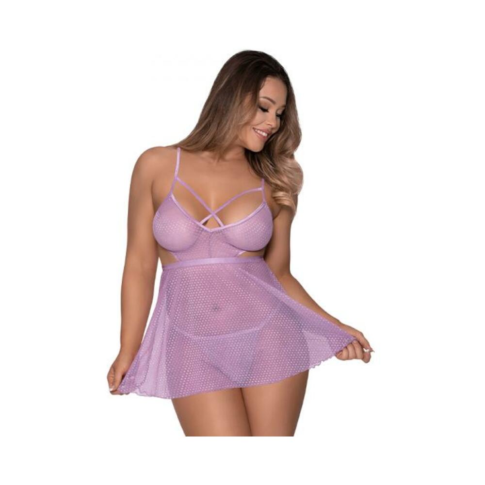 From the Exposed by Magic Silk collection, this style includes: a flowy, hip-length babydoll featuring a strappy criss-cross design in the front, adjustable shoulder straps with clear sliders and with swan hook closures at back. Paired with a matching crotchless G-string. Stretchy yet conforming lilac polka dot mesh complete with frilly ruffle details.