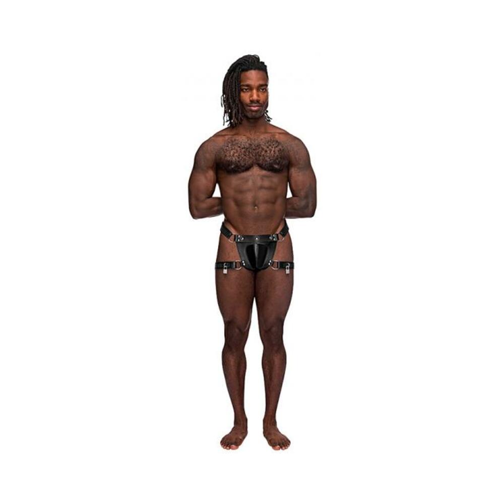 From the Leather collection by Male Power, this style includes: a chastity thong featuring an adjustable waist, leg, and T-back straps secured with locks and keys, a soft, stretch-leather pouch, and attached metal rings.