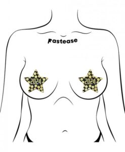 Happy New Year Pasties 2024 Black and Gold Star Nipple Covers by Pastease Brands. Introducing the Happy New Years 2024 Pastease: Ring in the New Year with Dazzling Elegance! Get ready to welcome 2024 in style with our exquisite Happy New Years 2024 Pastease. As the clock strikes midnight and the confetti begins to fall, let your spirit shine just as brightly as the fireworks with this one of a kind accessory. Dimensions: 3 inches by 3 inches.Coverage: 1.55 inches. Bold 2024 Design: Embrace the energy of a brand new year with the numbers 2024 show cased in a bold and striking font on these pasties. This design captures the anticipation and excitement that comes with a fresh start, reminding you that the best is yet to come. Champagne Bubbles of Celebration: Surrounding the numbers are effervescent champagne bubbles in radiant gold. Each bubble symbolizes a moment of joy, celebration, and the promise of unforgettable memories to be made in the year ahead. Glamorous Gold Sparkle: Printed on a glittering disco material, these nipple covers truly shimmer and shine with every movement. The golden sparkle mirrors the glitz and glamour of New Year’s Eve festivities, making sure you are the center of attention all night long. Unmatched Comfort and Quality: Our Happy New Years 2024 Pastease are not only a visual delight but also a comfort to wear. The breast coverings are crafted with the finest materials, they ensure a secure fit while allowing you to dance, mingle, and revel in absolute confidence. Collectible Keepsake: commemorate the beginning of a new chapter with a keepsake that encapsulates. Embrace the Future: The Happy New Years 2024 Pastease are not just an accessory; they’re a declaration of your enthusiasm for the journey ahead. With each step, you will be striding into the future with grace, style, and an undeniable zest for life. Do not just toast to the New Year make it unforgettable with the Happy New Years 2024 Pastease nipple pasties. Shine on, sparkle brighter, and step confidently into 2024. Get yours now and let the countdown to an extraordinary year begin! Categories: Holiday item, Lingerie, Clothing, Sexy Costume Accessories, Pasties and Accessories. 2023..