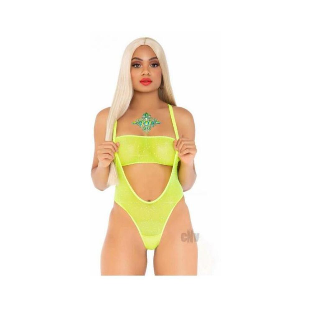 2 PC Rhinestone mesh bandeau and suspender bodysuit O/S NEON YELLOW